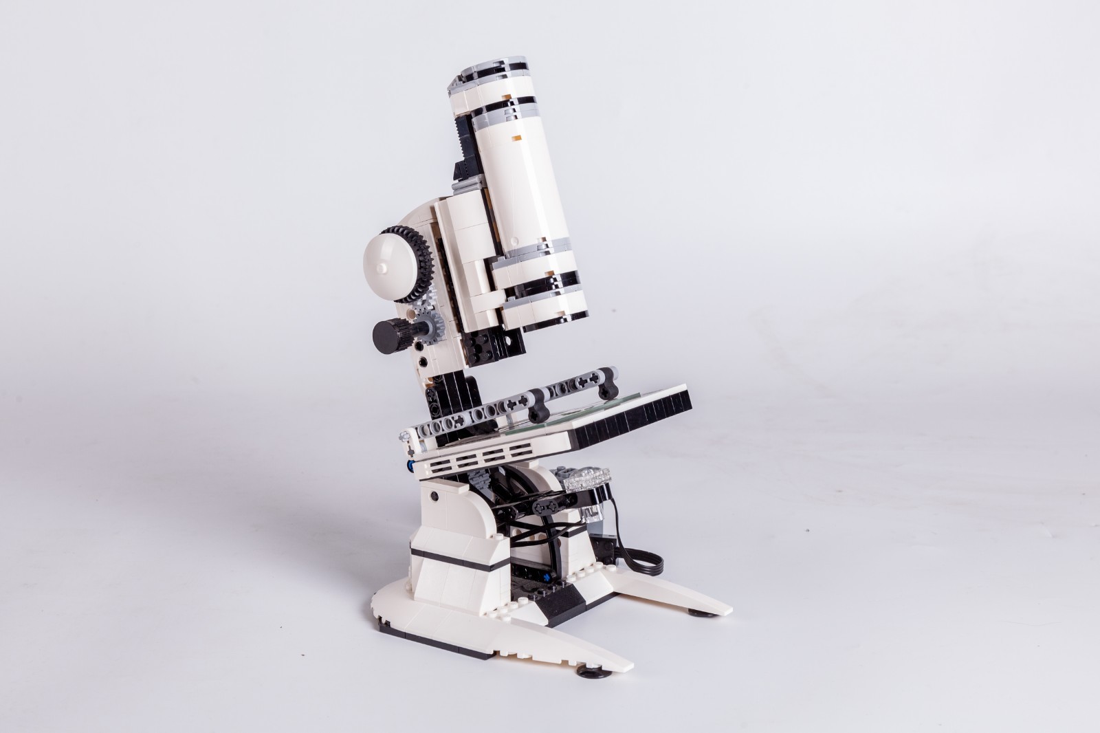 创作者Tony从乐高的放大器零件中得到灵感,运用多个放大镜零件并控制好其之间的距离,让光线经过多次折射呈现出显微的效果。在镜筒测试成功后,结合显微镜的结构原理,用一块块乐高®积木颗粒制作了镜筒的升降调整与微调结构、载物台、底部光源,镜臂、镜柱、镜座等部分,最终呈现出一台可以使用的显微镜。