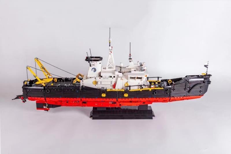 可以在水上航行是创作者Tony创作“遥控拖轮北极星”的初衷之一。他以珍珠棉作为填充解决浮力问题,用长距离的传动带动螺旋桨旋转,效仿RC船模的方法在船底加装了一根近50厘米长的配重让船体重心降低到水线以下,一步步突破科技零件本身的属性限制,最终创作出这台能够实现真正意义上航行的作品。
