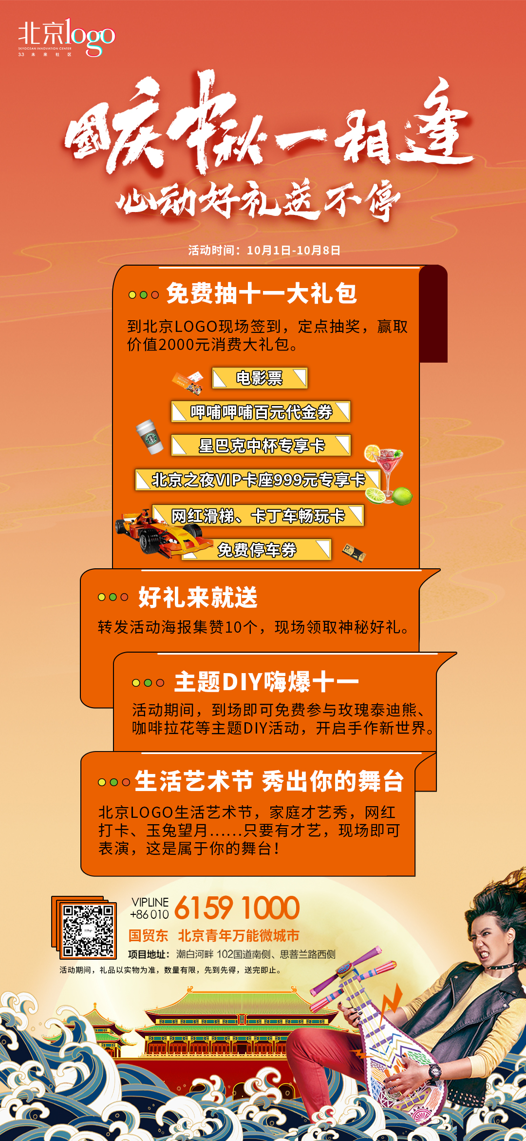 北京LOGO|3.3未来社区,国贸东北京青年万能微城市,“双节”活动即将重磅开启,心动好礼送不停。10月1日-8日,连续8天,好礼来就送、免费抽十一大礼包、主题DIY艺术体验馆、生活艺术节,四大主题活动,总有一款“安排”适合你!